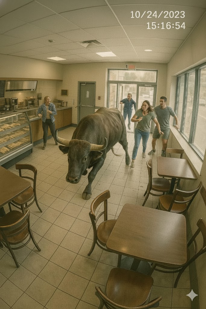 Kasnije je postalo jasno da je bik pobjegao s obližnje farme. Uplašen glazbom i ljudskim pokretima, oslobodio se, pobjegao niz ulicu i slučajno došao pred vitrine slastičarnice. Zbunjeno je gledao svoj odraz u staklu, misleći da vidi drugog bika. Nije bio agresivan, nego je pokušavao pronaći izlaz iz situacije.