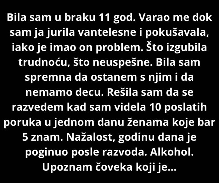 Jedanaest godina bila je u braku i dugo je živela sa uverenjem da se sve može popraviti ako se čovek dovoljno trudi, ako ne odustaje i ako veruje jače od sumnje. Ulagala je sebe do krajnjih granica, često i preko njih, u nadi da će zajedništvo koje je zamišljala jednog dana postati stvarnost. Dok je ona obilazila lekare, prikupljala nalaze, prolazila kroz iscrpljujuće procese vantelesne oplodnje i pokušavala da sačuva veru da će se majčinstvo ipak dogoditi, njen suprug je vodio paralelni život. Ironija cele situacije bila je bolna, jer problem sa potomstvom nikada nije bio isključivo njen, ali je teret uglavnom padalo na njena leđa. Ona je bila ta koja je trpela poglede, pitanja, terapije, nadu i razočaranja, dok je on birao bekstvo.