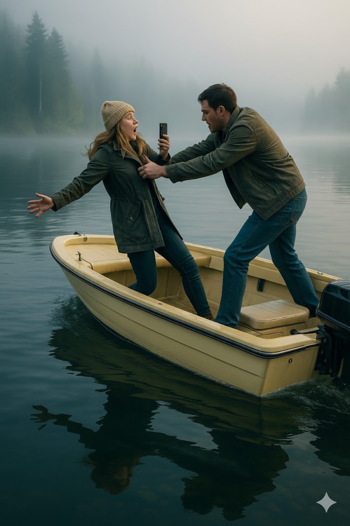 Aleks ustaje, prilazi ženi i u trenu — gura je u vodu. Marina vrišti dok pada, telefon joj ispada iz ruke, kamera se naginje i nakratko se vidi samo tresuća slika i površina vode. U pozadini se čuje šokirani uzvik: „Jesi li lud?!“ Snimka se tu prekida, ali posljedice tek počinju.