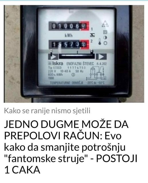 • Ova nevidljiva i stalna potrošnja poznata je pod nazivom „fantomska struja“, a upravo ona tiho povećava naše račune.Prema brojnim istraživanjima, eliminisanjem fantomske struje moguće je smanjiti ukupnu godišnju potrošnju električne energije i do deset posto. Možda se to na prvi pogled čini kao mali procenat, ali kada se pretvori u novac, jasno je da ta ušteda može značajno rasteretiti kućni budžet. Samo jednim pritiskom na dugme možemo napraviti razliku koja se osjeti svakog mjeseca.