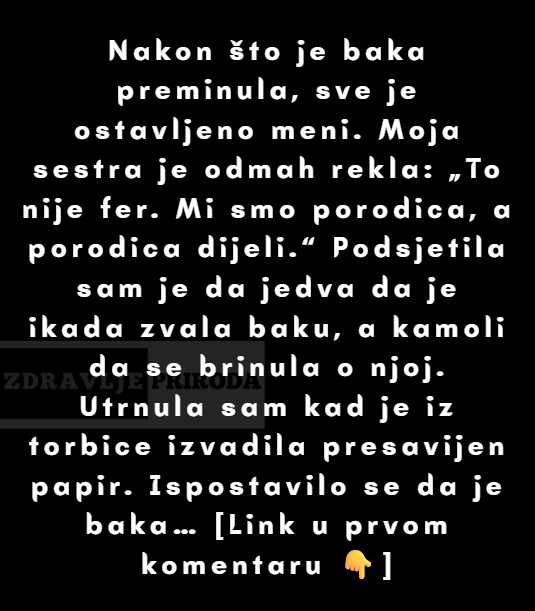 - Zakon je, međutim, bio jasan. Zvanična dokumentacija koju je baka potpisala pred kraj života jasno je govorila da sve ostavlja meni. Pismo staro petnaest godina nije moglo promijeniti tu činjenicu. Ipak, sestra nije odustajala. Počela je širiti priče da sam pohlepna, da sam iskoristila bakinu slabost i da sam sve smislila unaprijed. Te riječi su bile oštre i ranjavajuće. Ubrzo se sve pretvorilo u ozbiljan porodični sukob, a ona je čak zaprijetila da će me tužiti ukoliko ne pristanem na podjelu. Njene optužbe i glasine širile su se kroz komšiluk, pa sam se osjećala kao da sam nepravedno optužena za nešto što nikada nisam učinila.