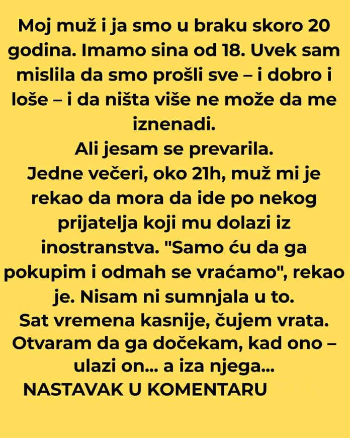 Te večeri sve je delovalo obično. Nije bilo svađe, nije bilo povišenih tonova, nije bilo onog neprijatnog osećaja u stomaku koji ponekad nagoveštava da nešto nije u redu. Bilo je oko devet uveče kada mi je rekao da mora da ode po prijatelja koji stiže iz inostranstva. Rekao je to usput, gotovo neobavezno, kao da govori da ide do prodavnice. Dodao je da će se brzo vratiti i da će taj prijatelj možda svratiti na kratko, dok se ne snađe. Ni u jednom trenutku mi nije palo na pamet da posumnjam u njegove reči.