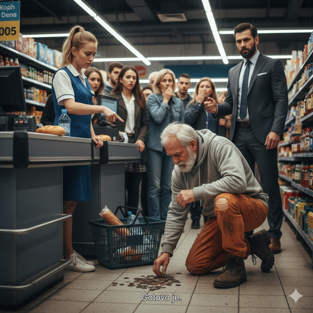 - Sara je jedva primetila šta je kupio. Brzo je otkucala cenu i bez podizanja pogleda izgovorila iznos. U njenom glasu nije bilo neutralnosti, već nervoze. Starac je polako zavukao ruku u džep i počeo da vadi novčiće. Prsti su mu drhtali dok ih je slagao jedan pored drugog, pažljivo, kao da mu je stalo da sve bude uredno i tačno.