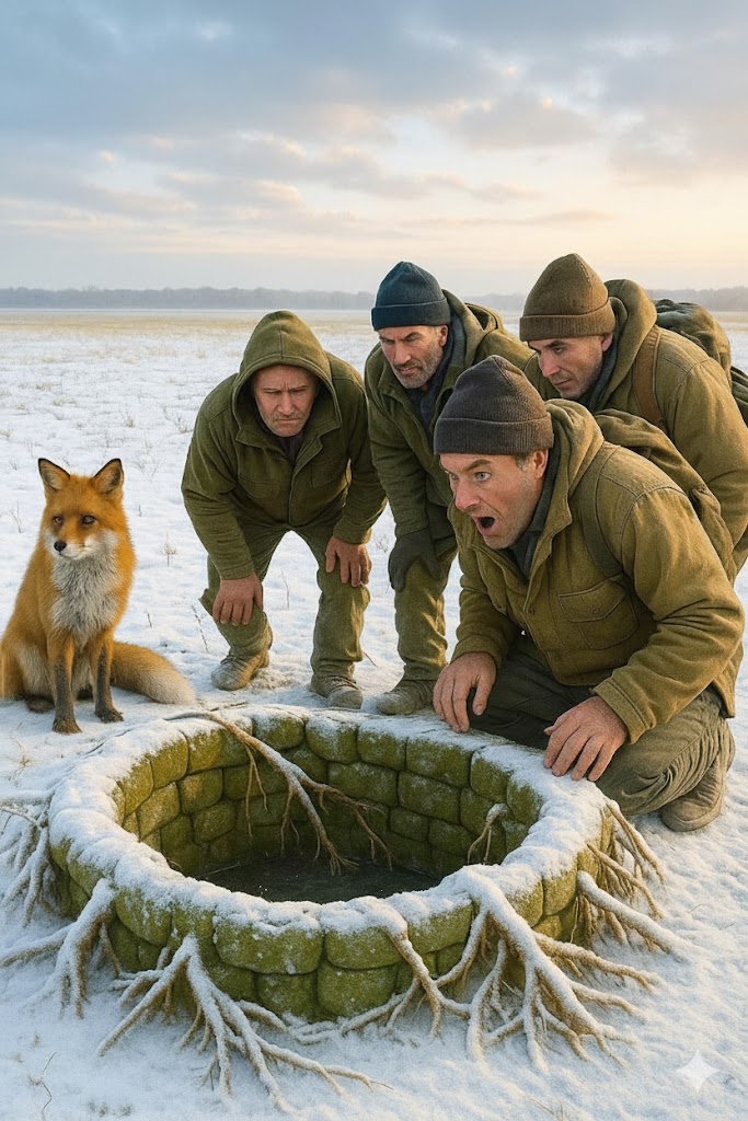 - Nakon nekog vremena, u daljini su primijetili nešto neobično – duboku, mračnu rupu gotovo potpuno prekrivenu snijegom. Lisica je stala na rubu rupe i smireno sjela, gledajući dolje. Lovci su se pitali šta je to, i pristupili su rupi.