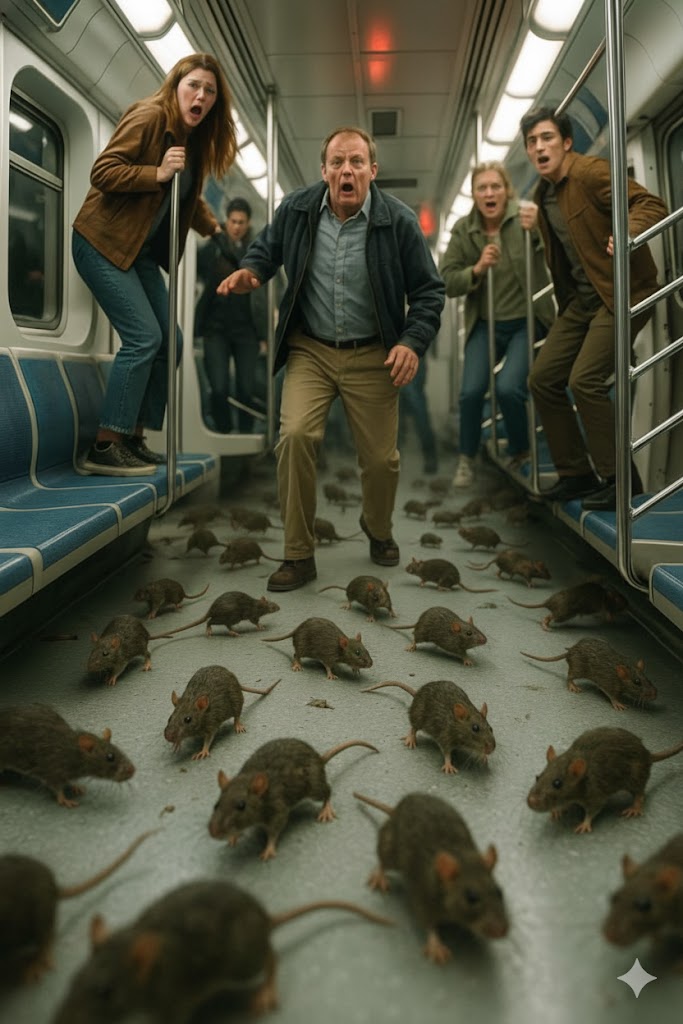 Nije stigla ni razmisliti o tome kada je prvi štakor potrčao preko poda vagona. Ljudi su reagirali instinktivno – neki su se trznuli, drugi povikali, a pojedini skočili na noge ne znajući kamo bi. Ali ono što je slijedilo pretvorilo je neugodu u pravu paniku. Iz svih smjerova počela su se pojavljivati desetke sivih tijela, raznih veličina. Dolazili su ispod sjedala, između gumenih spojeva, iz najmanjih otvora za koje nitko nije ni znao da postoje. Šuštali su svojim šapama po linoleumu, odbijali se od zidova vagona, penjali se po torbama i nogama.