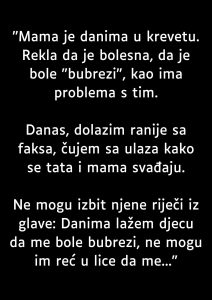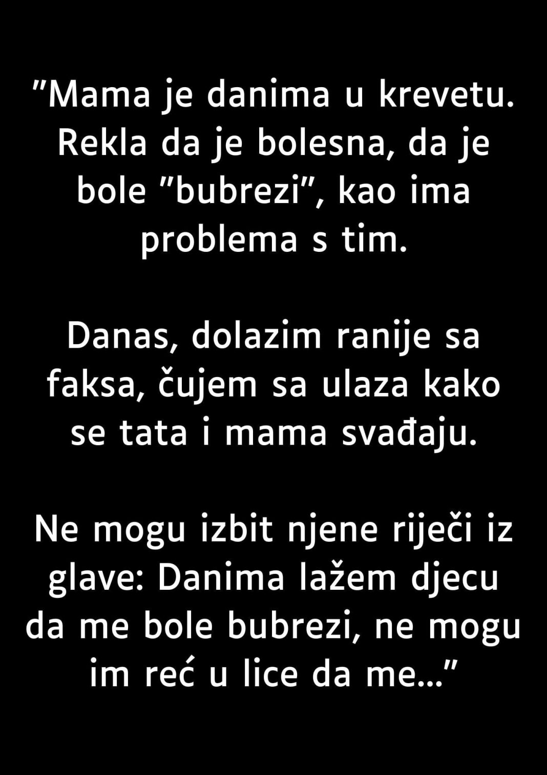 Vremenom sam počeo da drugačije posmatram majčinu tišinu i očevu strogoću. Iza njih su se krile neizgovorene priče, strahovi i kompromisi. Taj događaj me je naučio da pažljivije slušam, ne samo reči koje ljudi izgovaraju, već i one koje prećutkuju. Naučio me je da se bol ne mora uvek videti da bi bio stvaran i da se istina, koliko god bila teška, na kraju uvek probije na površinu. Majka se posle toga polako oporavljala, ne samo fizički, već i emotivno. Nije više govorila o bubrezima, ali je u njenim očima ostajao trag nečega što se ne može lako zaboraviti. Otac je postao tiši, povučeniji, kao da je i sam shvatio težinu onoga što se dogodilo. Naša porodica nije postala savršena, ali je postala iskrenija, ogoljena do suštine.