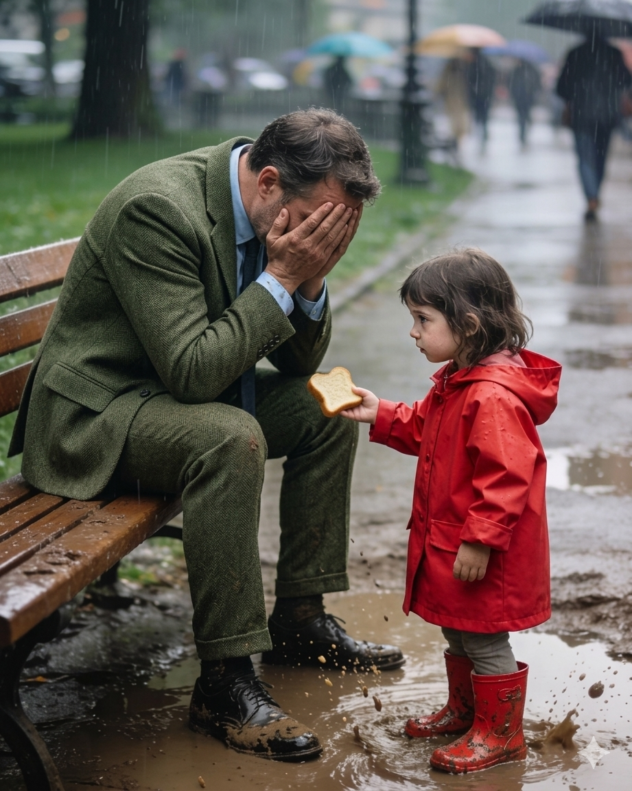 - Dok je pokušavao da obuzda suze koje su se mešale sa kapima kiše, prenuo ga je tanušan, dečji glas koji je postavio pitanje koje niko pre nije smeo da mu uputi. Mala devojčica, stara oko sedam godina, pitala ga je da li plače zato što je gladan. Prizor koji je ugledao bio je potresan. Devojčica je bila prljava, u prevelikom džemperu koji joj je jedva stajao na ramenima, sa kosom upletenom u neuredne pletenice. Ali u njenim očima sijala je neka neobjašnjiva mudrost i empatija. Pružila mu je polovinu svog skromnog obroka, zgužvani komadić hleba u salveti, govoreći mu da zna kako je to kada stomak boli od gladi.