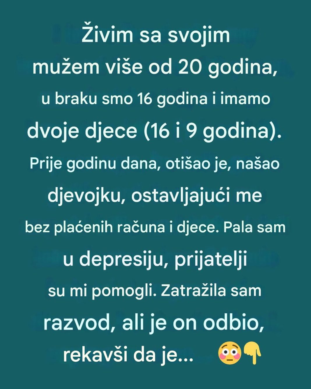 - Žena je započela svoju priču sa rečima: „Ja (46) živim sa mužem (48) više od 20 godina, u braku smo 16 i imamo dvoje dece (16 i 9).“ Iako su već imali dug brak, ništa nije moglo da je pripremi na ono što je usledilo. Pre godinu dana, njen muž je odlučio da napusti porodicu. Nije se obazirao na posledice, niti je pokazivao bilo kakvu zabrinutost za budućnost koju su zajedno gradili. Iako je veza bila duga, odjednom je sve prestalo da ima smisla. Žena je ostala sama, suočena s dvoje dece i gomilom finansijskih problema koji su je sve više opterećivali. Dok je ona pokušavala da nastavi život, njen muž je delovao kao da nije donio odluku koja će uništiti njen svet.