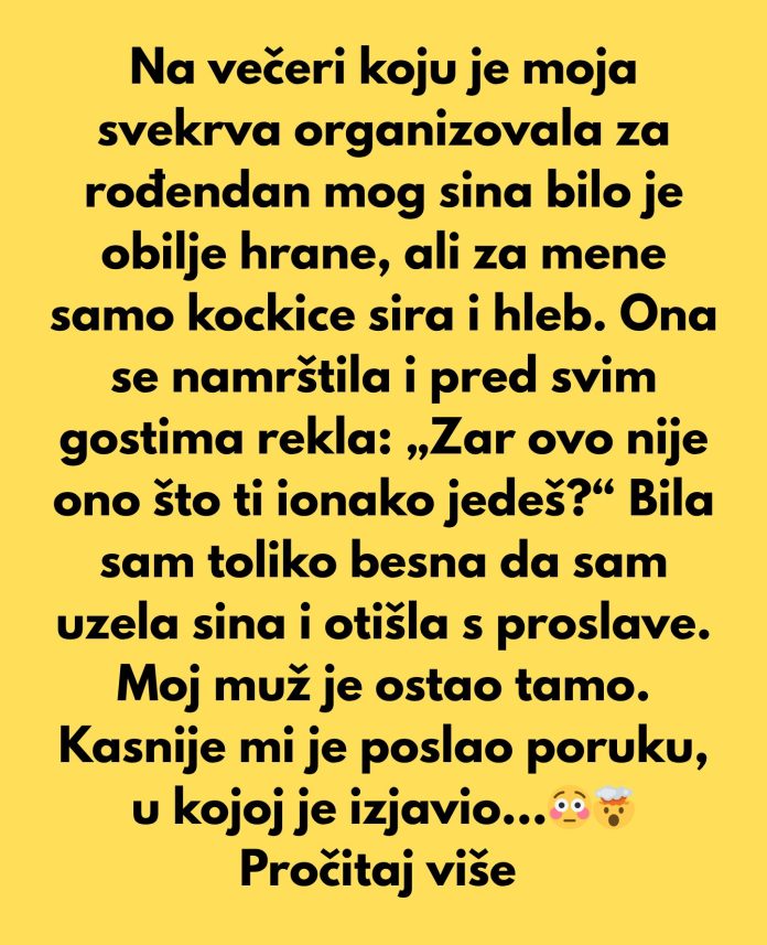 Njena granica bila je jasno određena – još od djetinjstva ona je vegetarijanka i to nije samo način ishrane, već dio njenog životnog izbora. Međutim, svekrva je odlučila da taj izbor ismije i predstavi kao nešto nevažno. Pred cijelom porodicom pripremila je obrok u kojem nije bilo ničega prilagođenog njoj, a zatim se kroz šalu, koja to zapravo nije bila, potrudila da je pred drugima dovede u neprijatan položaj. Ovaj čin nije bio slučajan previd, nego jasna poruka nepoštovanja. Kada se naruši dostojanstvo, teško je ostati miran, pa je žena donijela odluku da napusti okupljanje.