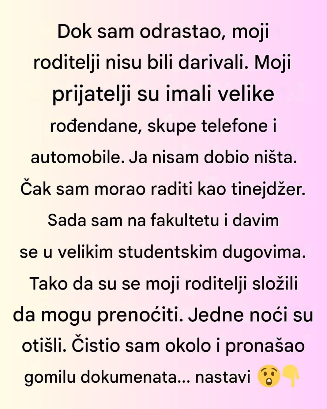 Kada sam otišao na fakultet, pritisak finansijskih obaveza postajao je sve teži. Zatražio sam od roditelja da me prime kod sebe na nekoliko meseci, nadajući se barem maloj podršci. Međutim, ono što sam pronašao u fioci mog oca, u potpunosti me šokiralo. U toj fioci su se nalazile stvari koje sam prepoznao kao njihove uštede i bogatstvo.
