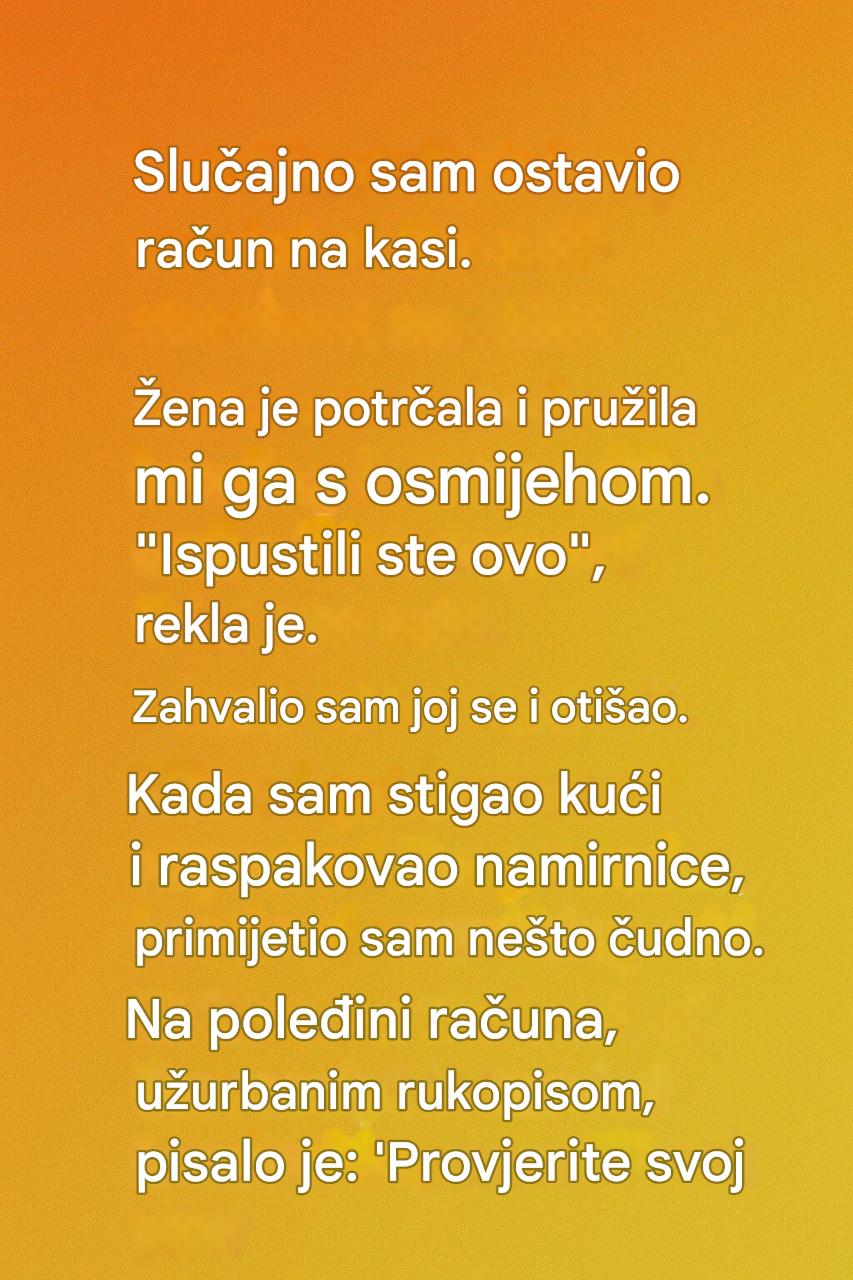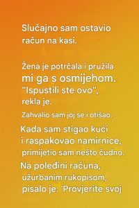 • Mali gestovi, koliko god se činili nevažnima, ponekad imaju najveći uticaj. Taj račun sada stoji na mom kuhinjskom pultu, iako mastilo već počinje da bledi, nisam ga bacila. Svakog dana prolazimo pored toliko ljudi — u prodavnici, na ulici, u saobraćaju — često ih ni ne primećujemo. Ali ponekad, u najmanjim trenucima, neko će stati, pogledati, obratiti pažnju, i učiniti nešto što će vam promeniti dan. U svetu koji je često brz, haotičan i, nažalost, pomalo grub, gestovi kao što je ovaj postaju neprocenjivo dragoceni. Ovaj mali rukopis na poleđini računa bio je više od samo obaveštenja. Bio je podsetnik na to da još postoje dobri ljudi, ljudi koji su spremni da pomognu, čak i kad nije u pitanju ništa veliko, nego samo mala, nenametljiva pažnja. Ovaj podsetnik mi je pokazao da, iako možda ponekad ne vidimo te ljude, oni su svuda oko nas.