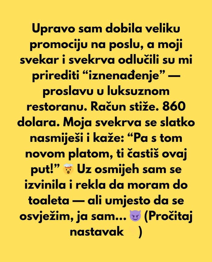 Račun za obrok bio je impresivnih 860 dolara, što nije bila mala cifra. Moja svekrva, s osmijehom na licu, okrenula se prema meni i izgovorila: “Pa, s tom novom platom, sigurno ti častiš ovaj put!” Pogledala sam svog muža, koji je, čudno, izgledao ponosno, kao da je to bilo nešto što je bilo očekivano. Taj trenutak izazvao je u meni osjećaj nelagode, jer nisam imala namjeru financirati proslavu koja je bila posve njihova ideja.