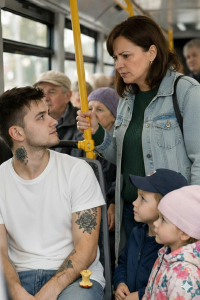- Ponovo je izgovorila zahtev, sada s jačim tonom, ali i dalje nije bilo odgovora. Napetost je dostigla vrhunac. Žena nije bila spremna da popusti, pa se okrenula ka ostalim putnicima i počela komentarisati ponašanje omladine. Dodala je kako „pravi muškarac ustaje kada je u pitanju majka sa decom“. Njena uverenost u ispravnost svog postupka bila je očigledna, ali situacija je imala neočekivani obrat.