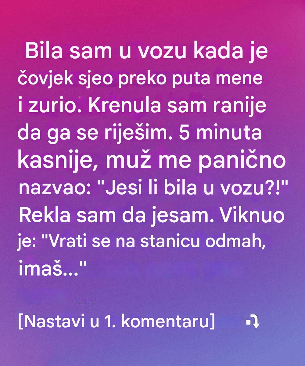 - Vrata su se zatvorila, voz je krenuo, a Claire je ostala na peronu, drhteći. Olakšanje i zbunjenost pomiješali su se u njenom umu. Da li je sve to bilo u njenoj glavi? Odluka je bila iznenadna, ali osećala je da je ispravna. Odlučila je da sačeka sledeći voz. Međutim, tada je njen telefon zazvonio. Poziv koji joj je odmah zaledio krv u žilama. Bio je to njen suprug, Mark. „Jesil li malopre bila u vozu?“ pitao je bez uvoda.