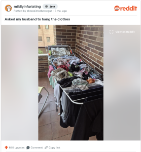 Jedna korisnica Redita podelila je fotografiju koja je mnoge frustrirala – prizor sušare za veš nakon što je njen muž završio kućni posao. Odeća je bila nagomilana jedna na drugu, što je onemogućavalo da se bilo šta pravilno osuši, a njegov izgovor da „više nema mesta“ izazvao je žestoku debatu o fenomenu poznatom kao „simulirajuća nesposobnost“. Ovaj slučaj postao je povod za brojne komentare i savete, od kojih su neki uključivali kreativne, iako pasivno-agresivne, metode rešavanja problema, dok su drugi nudili direktne i praktične savete za suočavanje sa partnerovim ponašanjem.